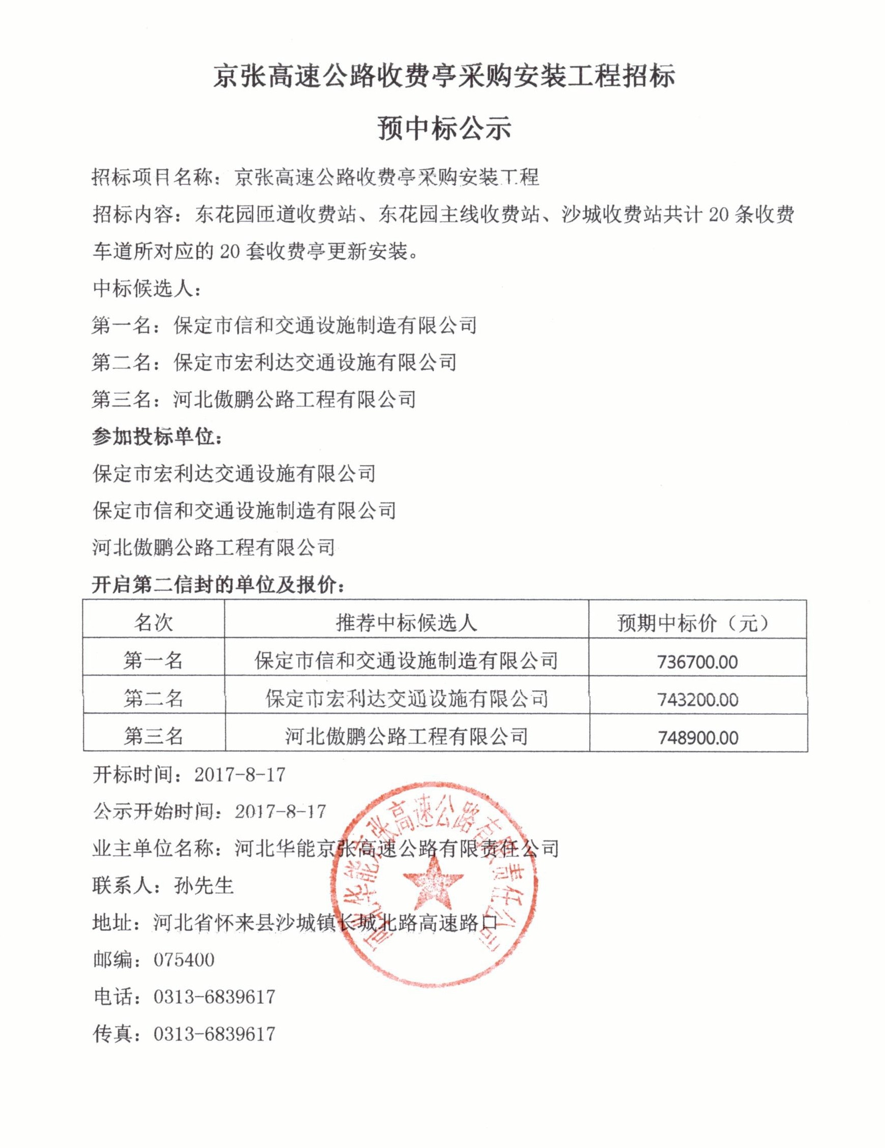 京張高速公路收費亭采購安裝工程招標預(yù)中標公示