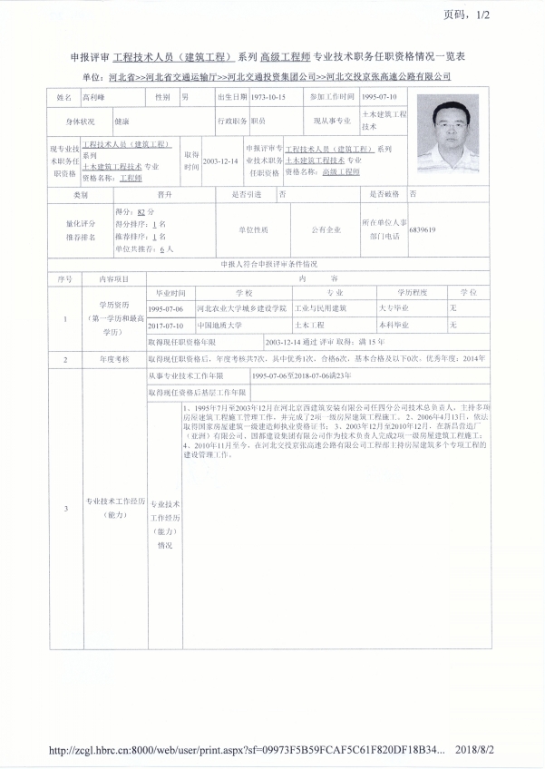 京張公司2018年度專(zhuān)業(yè)技術(shù)職稱(chēng)申報(bào)公示(高利峰)